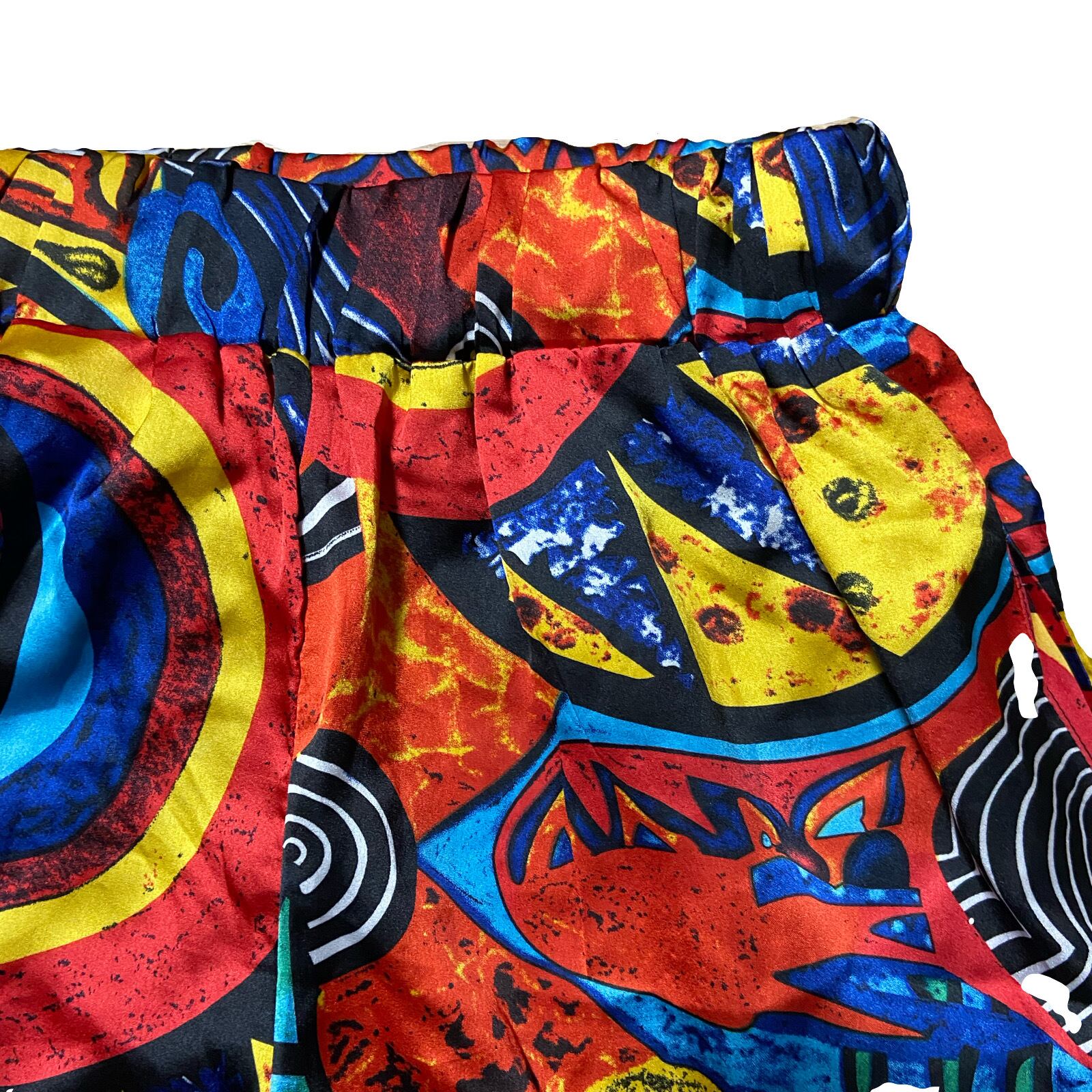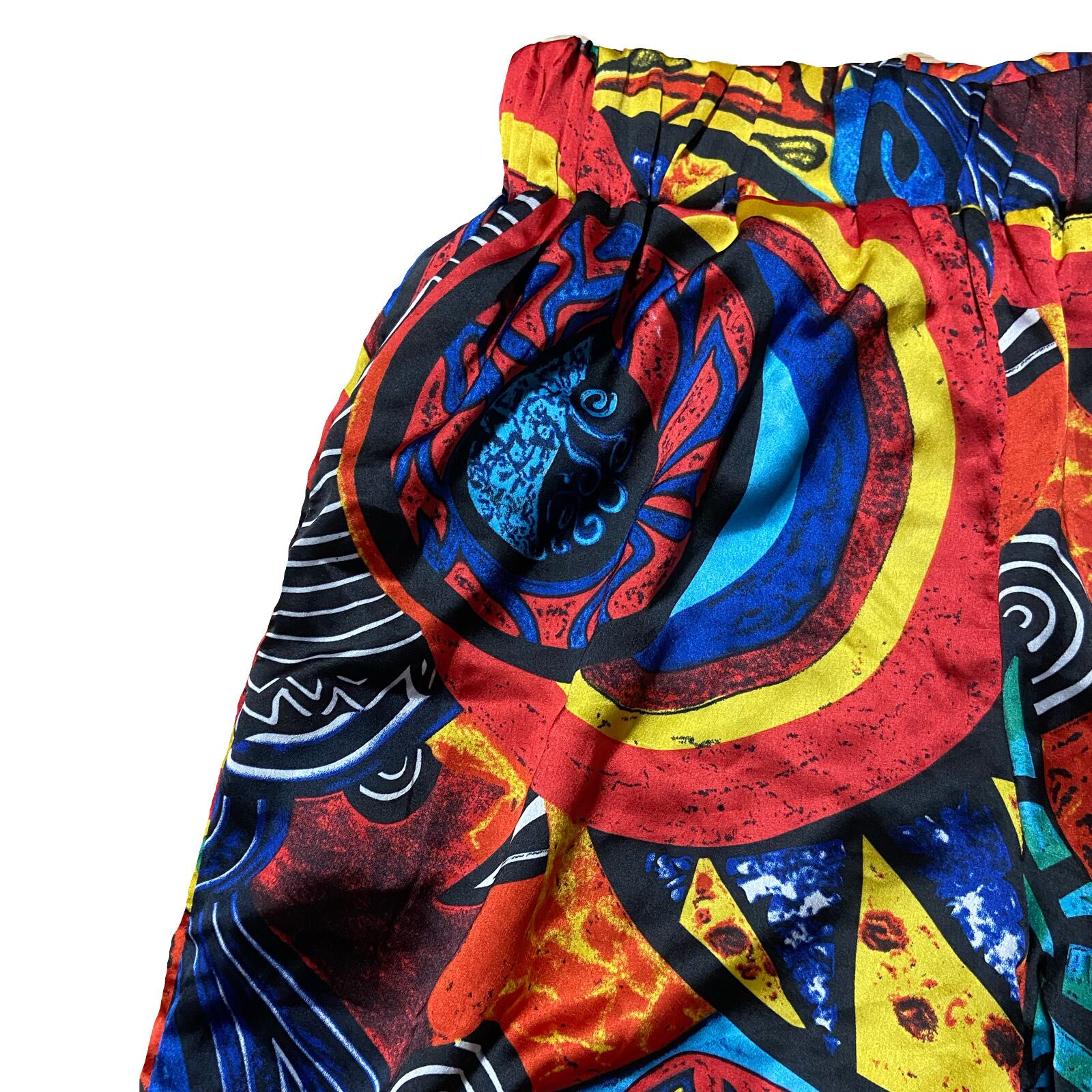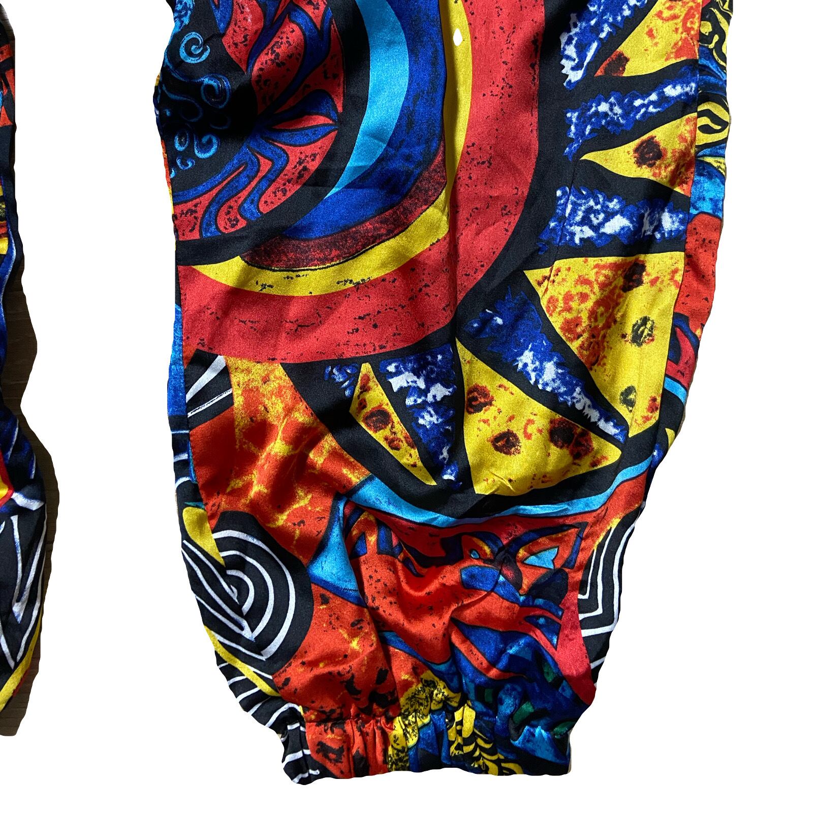 ナイロン地に誇張したアート柄が施されたイージーパンツ。ブルゾンではよく流通しておりますが、パンツではなかなかお見かけしません。かなり混沌とした柄からどことなく岡本太郎作品から影響を受けたのではないかと考察しております。