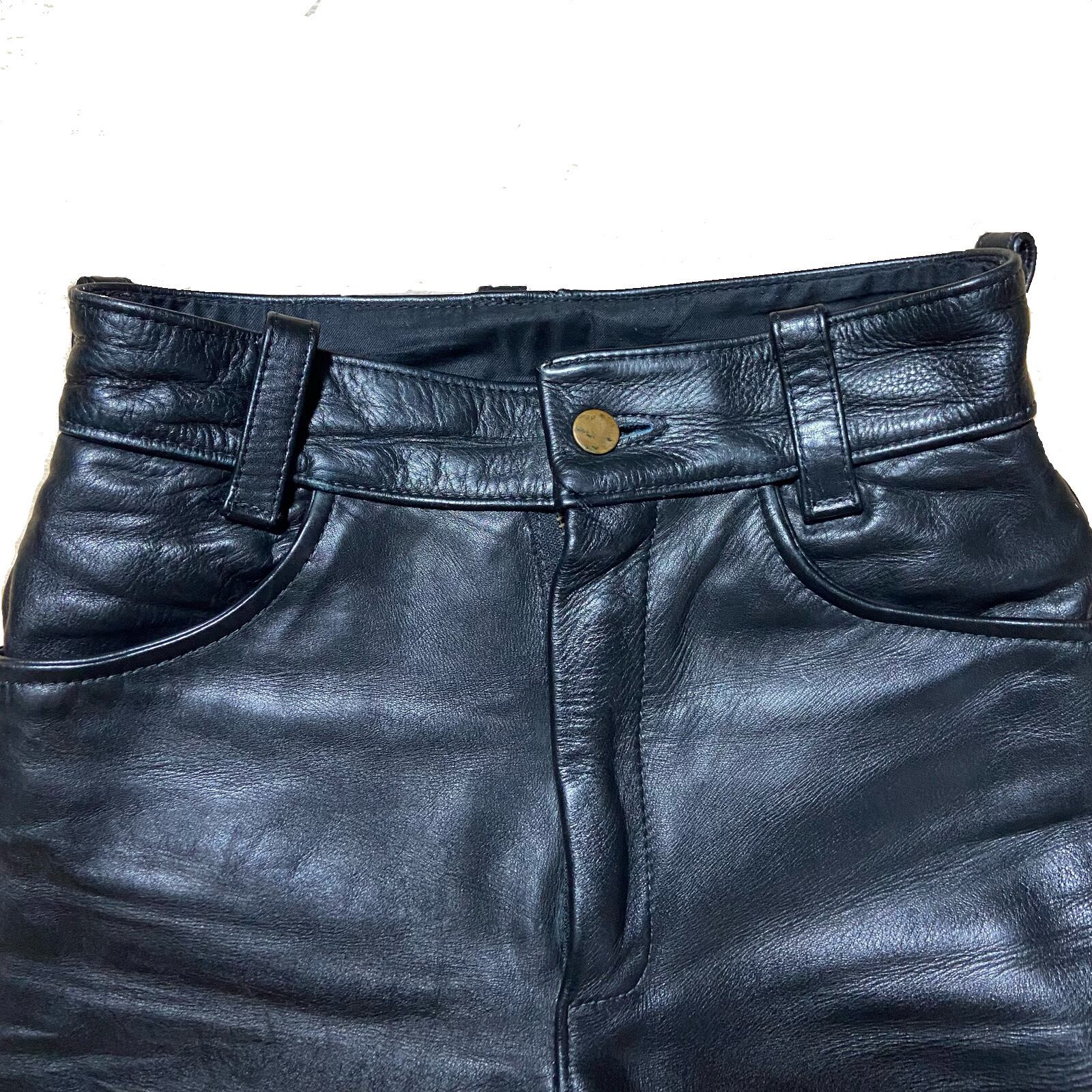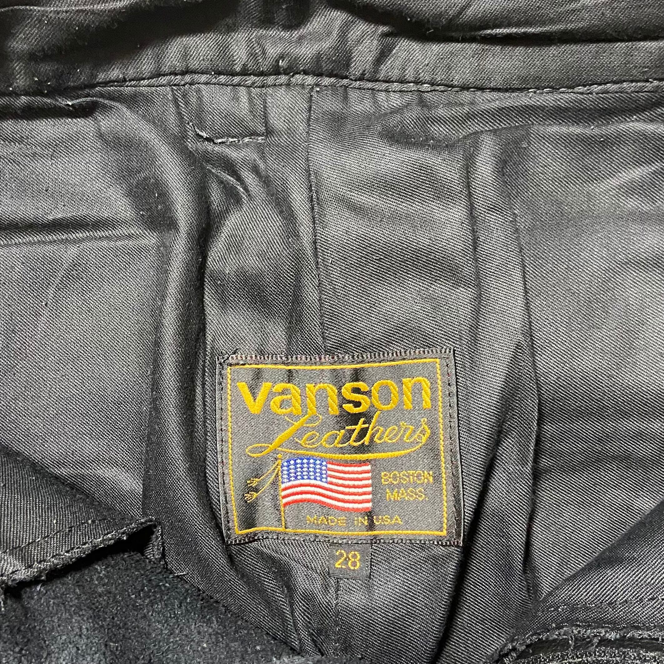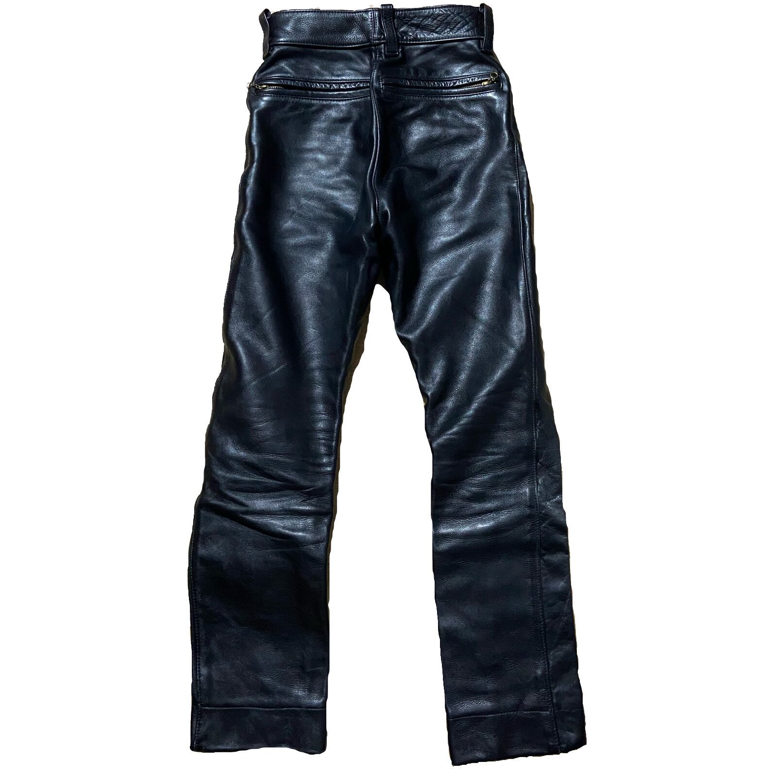 VANSONの本革のパンツです。本革特有のツヤと存在感が非常に目を引きます。タイト目なので細身の男性や女性にオススメです。